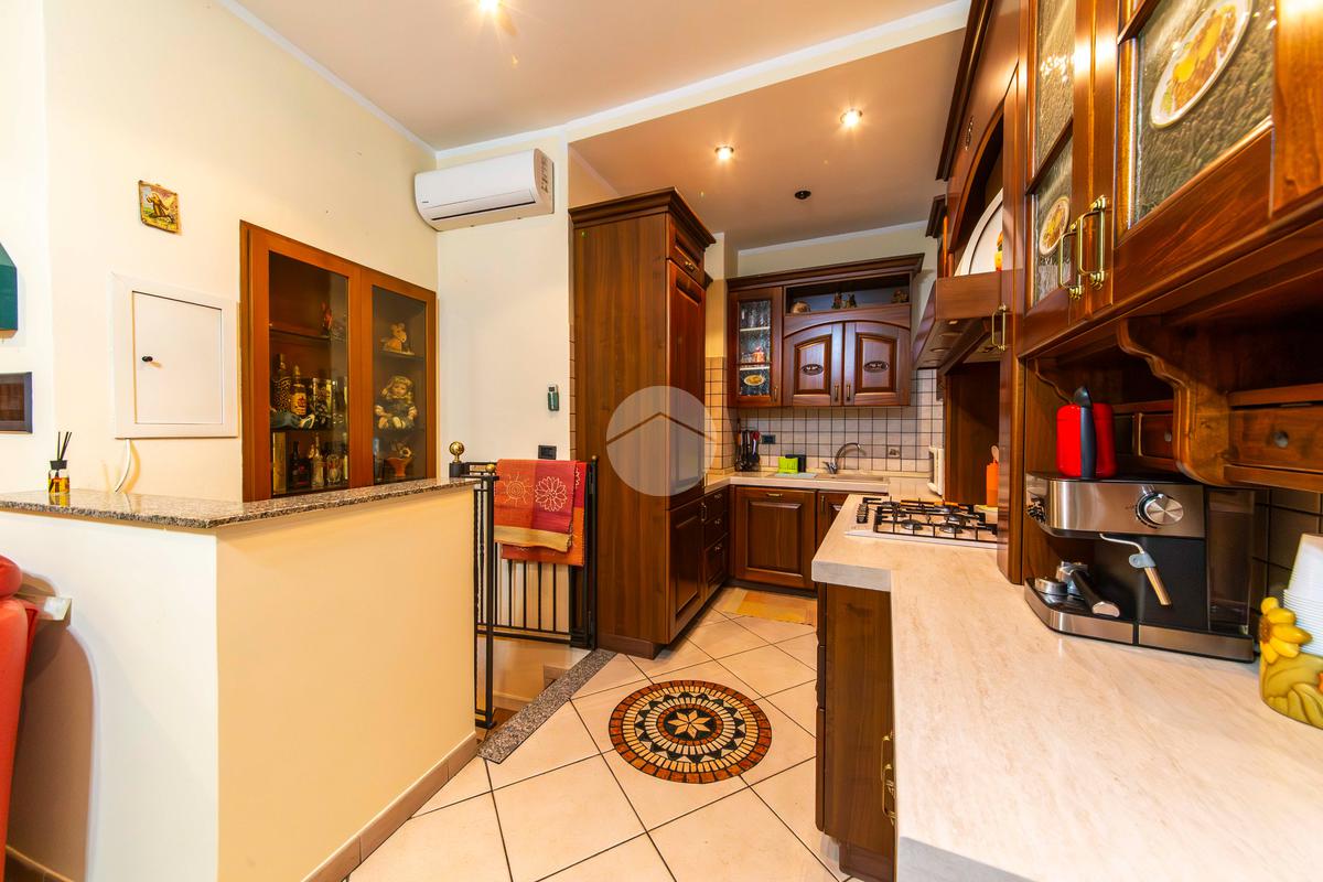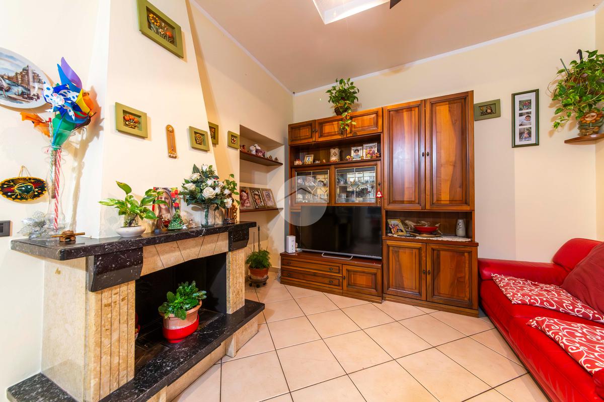 Ingresso diretto in ampia zona soggiorno, finestrata e con medesimo affaccio dell’ingresso, e dotata di camino, comunicante con la cucina a vista, a sua volta doppiamente finestrata e con affaccio tranquillo sulla Via Terni. Proseguendo attraverso una comoda porta scorrevole, accediamo poi alla zona notte, composta da un disimpegno, due camere da letto entrambe finestrate e con medesimo affaccio sulla Via Francesco Rismondo, ed un bagno anch’esso finestrato e dotato di vasca.
